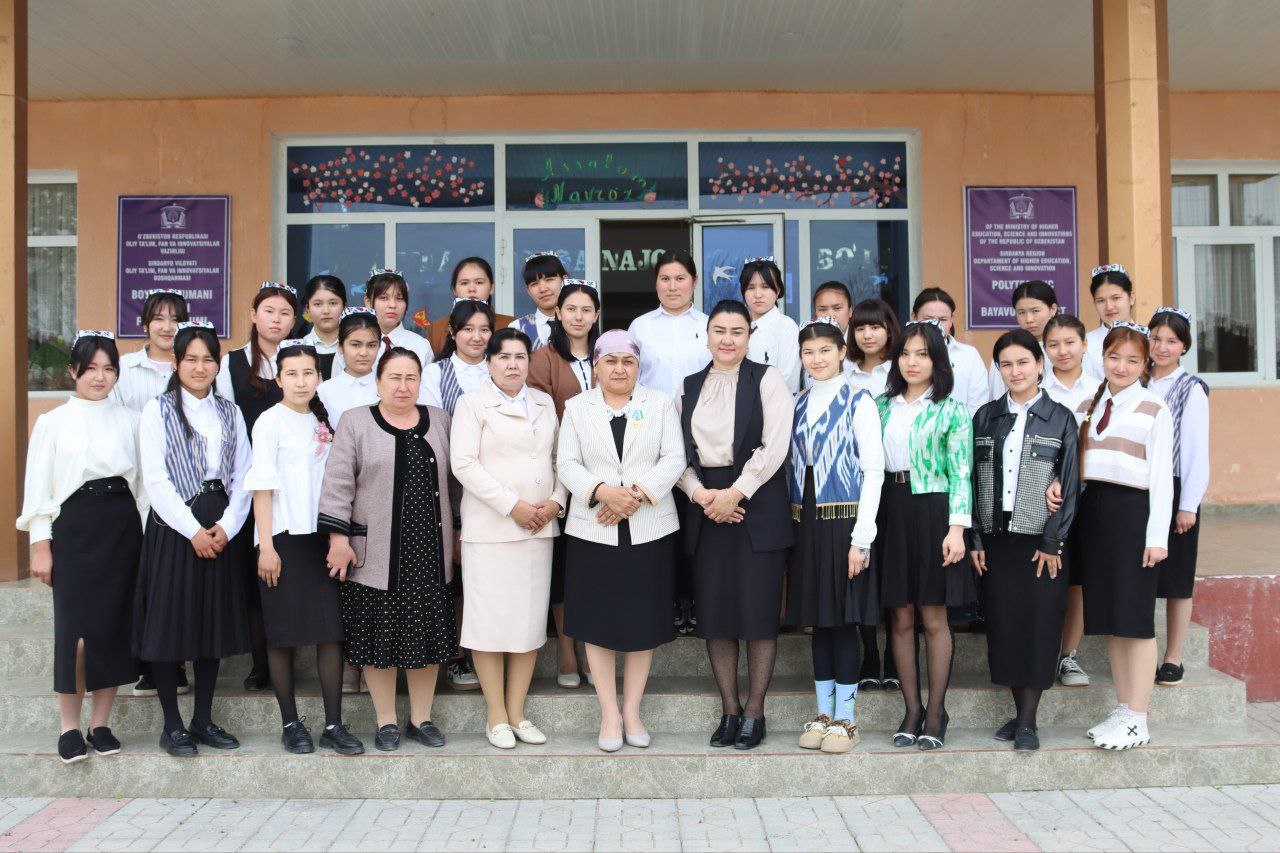 Boyovut tumanidagi 2-son politexnikumida “Bolg’ali qilich aka” va “Mirishkor nafosati gulshani” fermer xo‘jaliklari rahbarlari — “Shuhrat” medali sohibalari Gulchexra Karshibayeva va Nazokat Norxo‘jayevalar ishtirokida o‘quvchi-qizlar bilan ochiq muloqot tashkil etildi.